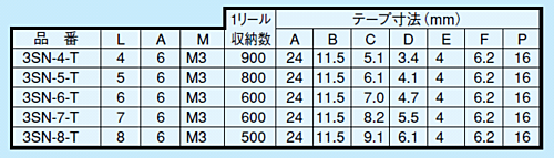 自動挿入機対応の表面実装用ネジです。下のポッチは位置ずれを防ぐためにつけてあります。1φのスルーホール穴をあけてください。色々な物を取り付けることができます。電気を流すこともできます。エンボステープに収納されています。・材質 黄銅・処理 ニッケル下地スズメッキ・定格電流 30A・締付トルク 5kg・f・cm以下●リール品3SN-4-T 入数:900本3SN-5-T 入数:800本3SN-6-T,3SN-7-T 入数:600本3SN-8-T 入数:500本※写真はイメージです。※在庫切れの場合は別途御相談させて頂きます。