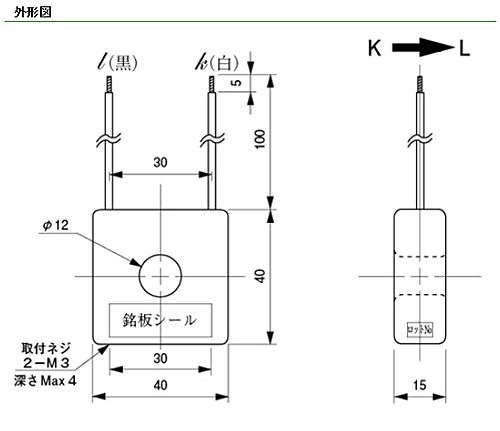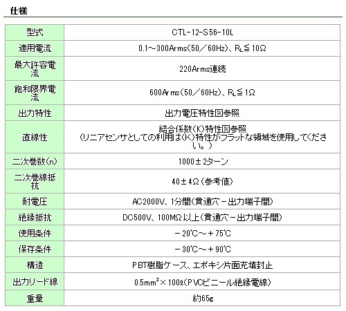〔特 長〕・貫通穴径φ12の中型電流センサ。容量拡大型(CTL-12-S56-10)と性能完全互換のリード線タイプ。・40mm角のコンパクトな形状ながら、最大適用電流300A、飽和限界電流600Aまで対応します。・1000:1の高変流比で、二次電流が小さく、直接電子回路へのインターフェースが可能。・出力リード線(0.5m㎡×100L)。・パネル取付用には、別売取付金具(HLD-12)が用意されています。