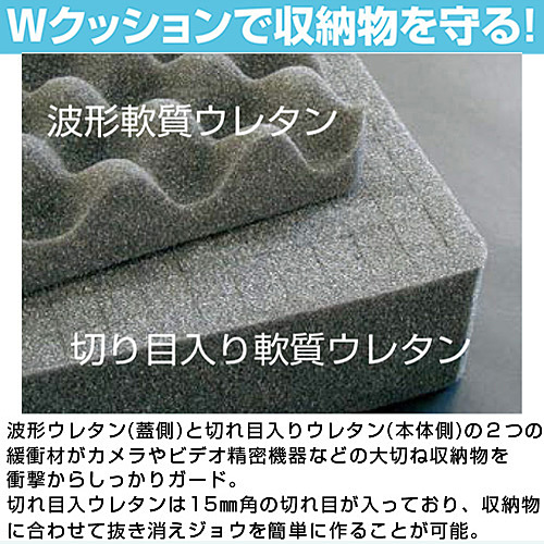 ●本体側、蓋側の2種類の軟質ウレタンが収納物を衝撃から保護します。