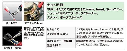 本体・キャップ・こて先3本セット・専用ケース・クリーナー・スタンドのセットこて先交換でホットエアとしても使用可能です。温度調整つまみではんだこて15~75W相当の熱量を自由にコントロ-ルします。充填用ガスは燃焼効率の良いポータソル専用ガスGP-20をお薦めします。※ご使用前にガスの充填を行ってください。(別売)仕様・質量 290g・1回の充填での最大使用時間(分) 45・ガス充填量(ml) 18・適合コテ GP-510・最高温度(℃) 580(はんだこて使用時)・全長(mm) 175・付属コテ先 GP-510RT-1C/GP-510RT-2.4C/GP-510HT/GP510ST※写真はイメージです。※在庫切れの場合は別途御相談させて頂きます。※RoHS対応状況:製品ごとに異なりますのでメーカーホームページより御確認ください。