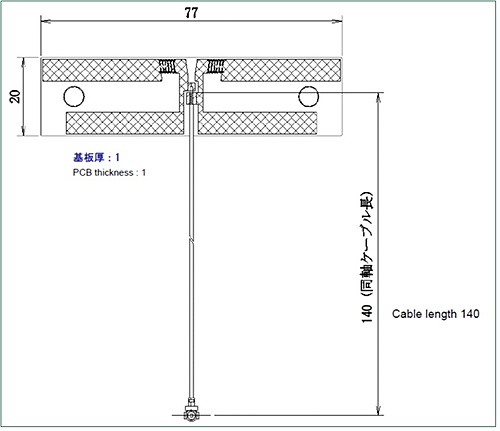 技適申請用番号:T16-062-1015 コネクタ:U.FL 型式:ダイポールアンテナ (λ/2) 周波数:814~960[MHz]: ≦3dBi 1428~2690[MHz]: ≦3dBi 最大利得:3[dBi]以下 内蔵アンテナ/77mm×20mm