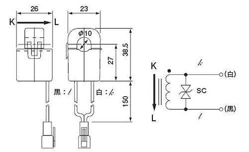 適用電流:0.01~80Arms (50/60Hz)、RL≦10Ω最大許容電流:120Arms連続飽和限界電流:特性図点線表示部以下出力特性:1V±2%/50A (50/60Hz, RL=60Ω)直線性:±1%/FS (50/60Hz, RL=60Ω)公称変流比:3000:1二次巻線抵抗:400Ω (参考値)出力保護:7.5Vpクランプ素子内蔵耐電圧:AC1000V(50/60Hz)、 1min(コア-出力コネクタ端子一括間)絶縁抵抗:DC500V、≧100MΩ (コア-出力コネクタ端子一括間)使用条件:-20℃~+50℃、≦80%RH、結露のないこと、屋内組込用、取付方向フリー保存条件:-30℃~+90℃、≦80%RH、結露のないこと構造:ナイロンケース簡易閉鎖型フェライトコア・ケース入クランプ構造ナイロンヒンジ/ナイロンスプリング方式許容脱着回数:概略100回程度出力リード線:UL1007ビニール電線(AWG22X150?)出力コネクタ:ピンコンタクト : SYM-001T-P0.6リセプタクルハウジング : SMR-02V(日本圧着端子製造㈱)適合端子:ソケットコンタクト : SHF-001T-0.8BSプラグハウジング : SMP-02V-BC、NC(日本圧着端子製造㈱) (付属しません)質量:約 45g