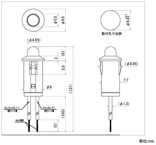 ■仕様 耐電圧:AC500V (1分間) 絶縁抵抗:DC500V、100MΩ以上 本体材質:ポリカーボネート 主絶縁材:PBT リード線:UL1007 AWG26 撚り線 本体色:B (黒)、W (白) レンズ色:R (赤)、G (緑)、Y (黄)、BL (青) パネル取付方式:ワンタッチ装着 取付板厚:0.5~2.0mm 使用上の注意: ①本製品には保護抵抗は内蔵されておりませんので、使用電圧に合わせた保護抵抗を直列に接続してご使用ください。②接続の際は極性にご注意ください。③取付板厚によって取付孔寸法が異なる場合もありますのでご確認ください。 ※在庫がある場合がございますので、お問合せください。