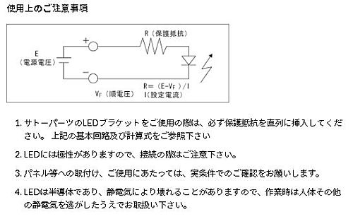 ①本製品には保護抵抗は内蔵されておりませんので、使用電圧に合わせた保護抵抗を直列に接続してご使用ください。②接続の際は極性にご注意ください。③取付板厚によって取付孔寸法が異なる場合もありますのでご確認ください。