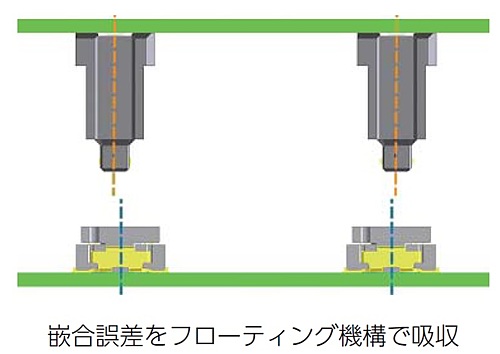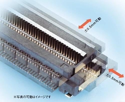 基板にコネクタを実装する際に生じる縦横方向の誤差を吸収する機構(フローティング機構)を搭載したコネクタのことです。 コネクタが可動することで嵌合時の誤差やズレを吸収することができ、ストレスによる接圧低下、インシュレータの破損、半田付け部のクラックによる導通不良の不具合を防ぐことができます。