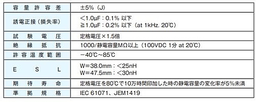 【特長】 ・IGBT/IPMへの直付け仕様 ・低ESR/低ESL ・105℃対応品 ・ケース及び充填剤は難燃性μL94 V-0認定の難燃性樹脂使用 【定格】 ・定格電圧:1200VDC ※写真はイメージです。