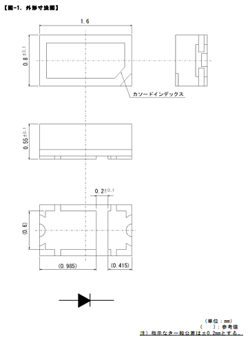 発光材料にInGaNを用い、波長変換材入り樹脂でパッケージしたリフレクター付き白色発光サーフェイスマウントチップLED 【特性】 パッケージタイプ:Reflector LEDタイプ:High Brightness アプリケーション:Amusement Data Storage Helthcare Home Appliance Industrial Equipment Office Equipment PC パッケージサイズ[mm]:1.6x0.8 (t=0.55) 発光色:White 光度(Single)(Typ.)[mcd]:1500 光度ランク数:4 色度(xy):(0.284 0.303) 順方向電圧 VF (Typ.) [V]:3.2 IF @ VF [mA]:40 素子材質:InGaN 許容損失Pd [mW]:152 動作温度範囲[℃]:-40 to 110 保存温度範囲[℃]:-40 to 110