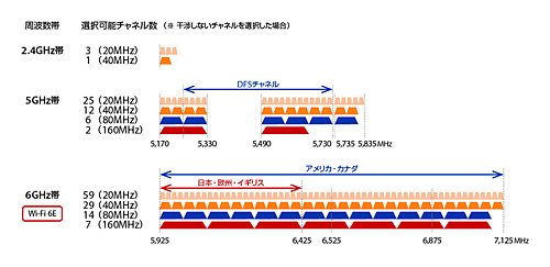 更にWi-Fi 6Eは5,925~7,125MHzという従来のWi-Fiには開放されていなかった周波数帯域の利用が可能になり、選択可能なチャネル数が増加することにより、より快適な通信環境の構築が可能になります。
