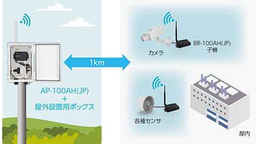 ・屋外利用で広域な無線LANネットワーク温度拡張版AP-100AH(JP)は屋外設置用ボックスと組み合わせることで、屋内外でシームレスな広域無線LANネットワークを構築することができます。従来の無線LAN規格では複数台のアクセスポイントが必要でしたが、台数を削減できるため設置コストの低減が期待できます。・従来ネットワークとのシームレスな接続性AP-100AH(JP)は、920MHz帯無線の利点と無線LANの使いやすさ、汎用性、相互接続性を兼ね備えています。有線LANを介して従来のIEEE 802.11a/b/g/n/ac/axの無線LANネットワークにAP-100AH(JP)を接続することで、長距離で多台数接続が可能なIEEE 802.11ahネットワークの利点を活用することができます。・さらに距離を延長できる「中継機能」本機能を利用することで、推奨最大3kmでの通信や通信ルート上にある障害物の回避が可能です。・最新セキュリティ WPA3™対応・設置時の事前調査をサポートする「簡易サーベイ機能」周囲の920MHz帯チャネル使用率から、AP-100AH(JP)が行う802.11ah通信への影響を推定することができます。無線機器の最適な設置場所や利用チャネルを、事前に調査・検討することにご活用いただけます。