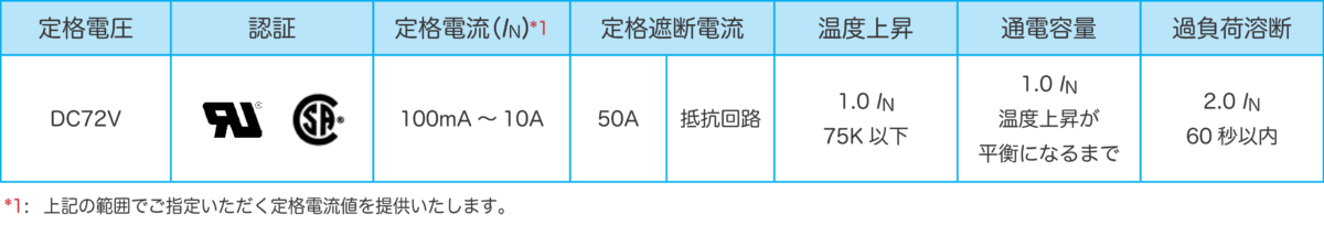 【特性】●定格電圧:DC72V●定格電流:100mA〜10A●定格遮断電流:50A●温度上昇:1.0 IN 75K以下●通電容量:1.0 IN 温度上昇が平衡状態になるまで●過負荷溶断:2.0 IN 60秒以内●溶断特性:速断【認証】●100mA-10A UL248-1、UL248-14 Recognized●100mA-10A CSA C22.2 No.248.1、CSA C22.2 No.248.14 Certified【特徴】●高耐熱性、高強度のセラミック容器による高遮断性能●内部構造のデザインにより外的温度の影響を抑制、薄膜タイプに比べ低抵抗●端子可動構造によりエレメントへの外的応力印加防止●エレメントと端子の溶接により基板実装時の熱的影響を抑制●RoHS2対応・鉛フリー●半田レス●中空容器により放熱の影響を抑え優れた速断性【その他】●標準納期は数量、時期によって変動することがございます。●受注単位数のご要望がある場合、別途ご相談ください。【アプリケーション】●OA機器●カーナビゲーション●セキュリティ機器●ポータブル機器●監視カメラ●車載用インフォテインメントシステム●アダプタ●リモコン●バッテリーマネジメントシステム●モータードライバー●自動車用電子機器●DC二次回路【製品情報ページ】https://www.socfuse.com/ja/products/detail/11cf耐ラッシュタイプはこちら↓https://www.socfuse.com/ja/products/detail/11ct