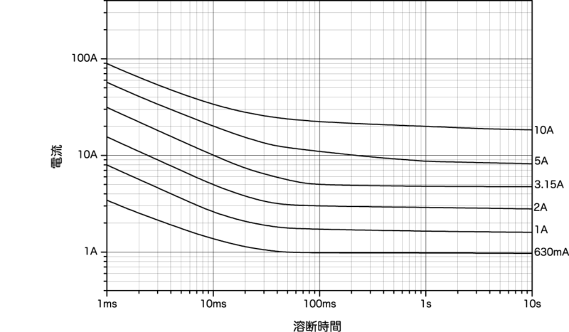 当社が試験条件を特定して測定した実測値の平均値をプロットしておりますので、保証値ではありません。ヒューズの特性は使用条件によって変化しますので、貴社のご使用条件下で、ヒューズが貴社のご要求を満足しているかを実際にご確認頂く必要があります。