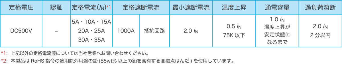 【特性】●定格電圧:DC500V●定格電流:5A〜35A●定格遮断電流:DC500V 1,000A●温度上昇:0.5 IN 75K以下●通電容量:1.0 IN 温度上昇が安定状態になるまで●過負荷溶断:2.0 IN 2分以内●代表抵抗値:5A=23mΩ 10A=12mΩ 15A=6.9mΩ 20A=5mΩ 25A=3.8mΩ 30A=2.9mΩ 35A=2.5mΩ【特徴】●巻線エレメントによる優れた耐ラッシュ性と高信頼性●確実なネジ締端子により接触抵抗を抑え大電流通電に対応●エレメントと端子を外部はんだで接合した高信頼性●RoHS2対応●AEC-Q200(Rev.E)適合【その他】●標準納期は数量、時期によって変動することがございます。●受注単位数のご要望がある場合、別途ご相談ください。【アプリケーション】●EV、PHEV、HEV●サーボモーターアンプ●車載用充電器●FCV●車載用エアコン回路●車載用DC/DCコンバータ●EV補助用アプリケーション【製品情報ページ】https://www.socfuse.com/ja/products/detail/dc500vbc625a/ボルト締めタイプはこちら↓https://www.socfuse.com/ja/products/detail/dc500vbi625c/【用途例】●自動車電気自動車、PHEV/HEV、燃料電池車、EVバス・トラック、EVバイク、補機用●新エネルギー太陽光発電。風力発電、中小水力発電、バイオマス発電